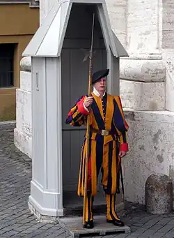 The Pontifical Swiss Guard wears large black berets, draped to the right. The beret badge is a symbol indicating the rank of the wearer, and is worn essentially above the left ear.