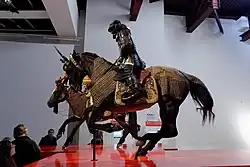 In the first conflict between Shingen and Kenshin they were very cautious, only committing themselves to indecisive skirmishes. There were a total of five engagements at Kawanakajima.[42] Only the fourth battle was a serious, all-out battle between the two.[43] During the fourth battle, Kenshin's forces cleared a path through the Takeda troops and Kenshin engaged Shingen in single combat. Kenshin attacked Shingen with his sword while Shingen defended with his Japanese war fan (tessen). Both lords lost many men in this fight, and Shingen in particular lost two of his main generals, Yamamoto Kansuke and his younger brother Takeda Nobushige.[44] After the death of Shingen, Tokugawa Ieyasu borrowed heavily from Shingen's governmental and military innovations after he had taken leadership of Kai Province during Toyotomi Hideyoshi's rise to power. Many of these designs were used by the Tokugawa shogunate.