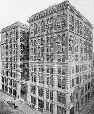 The Mills Building was a 10-story structure that stood at 15 Broad Street and Exchange Place[1] in Manhattan, with an L-shaped extension to 35 Wall Street. It wrapped around the J. P. Morgan & Company Building at 23 Wall Street, on the corner of Broad and Wall Streets.[2] George B. Post was the architect of the edifice.