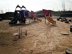 The 'sandscape' area has been designed for toddlers and has slides, a bridge and a large seat for parents. The 'marshland' space, has been primarily designed for older children, it features a 7m space-net, reminiscent of the rigging on barges that travelled on the creek. The hill is a place where teenagers can sit.[17]