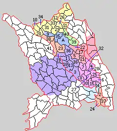 1889 administrative map of five districts in Southeastern Saitama with the municipalities (numbers) and municipal associations (chōson kumiai; letters) of South Saitama District; colours indicate current/recent (2011) municipalities. 1. represents Iwatsuki Town, the district seat. Miyashiro Town, the last remaining municipality after the Great Heisei mergers, was created in 1955 by the merger of 39. Monma Village (百間村) and 40. Suka Village (須賀村).