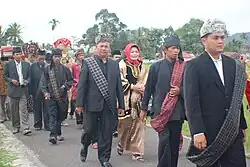 People are marching convoy the New Datuk (leadership) to the venue of the ceremony of Batagak Datuak or Batagak Penghulu in Minangkabau tradition, West Sumatera.
