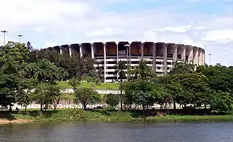 Mineirinho is located in the Sports Complex of Mineirão Stadium in the Pampulha,[9][10] which was one of the headquarters of the 2013 FIFA Confederations Cup[11] and the 2014 FIFA World Cup.[12][13] The nickname (small Mineiro) is due to being located close to the larger Mineirão (big Mineiro), the stadium.[14]