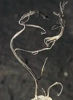 Native silver from the Bulldog Mountain Mine, Creede District. Size 4.5 x 2.6 x 0.25 cm.