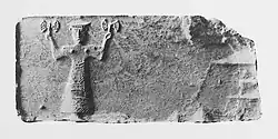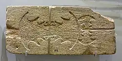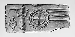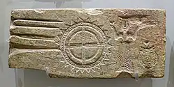 The Minoan Moulds of Palaikastro (Greek: Μήτρες του Παλαιοκάστρου Σητείας, romanizedMitres tou Palaiokastrou Sitias) are two double-sided pieces of schist, formed in the Minoan period as casting moulds for plaques with figures and symbols. These include female figures with raised arms, labrys double axes (Λάβρυες, labryes) and opium poppy flowers or capsules, two double axes with indented edges, the Horns of Consecration symbol, and a sun-like disc with complex markings, which has been claimed by some researchers to be for making objects to use in astronomical predictions of solar and lunar eclipses.