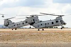 A major element of each year's show is the MAGTF Demo, a simulated assault by numerous Marine Corps units that demonstrates the air, ground and logistical elements of the Marine Air Ground Task Force.[7] The demonstration is performed each day of the show and features an array of fixed-wing, helicopter and tilt-rotor aircraft[8]—F/A-18 Hornet and AV-8B Harrier jets, CH-53E Super Stallion, AH-1 Cobra and UH-1Y Venom helicopters, the MV-22 Osprey, and KC-130 Hercules tankers—all in the air simultaneously. The Hornet and Harrier jets take turns flying simulated attack runs and demonstrate mid-air refueling with the KC-130. The MV-22 Ospreys also demonstrate refueling, then deliver Marine Corps ground troops to the airfield, while the Cobra gunships simulate attack and air cover roles. (The MV-22 Osprey tilt-rotor aircraft joined the MAGTF demo in 2010 and replaced the CH-46 Sea Knight entirely in 2014 as the aircraft was phased out of the Marine Corps inventory.) The UH-1 delivers a team of Marine infantry via a fast-rope insertion, where they simulate calling in a naval artillery barrage, then retrieves them in a Special Patrol Insertion/Extraction maneuver. On the ground, Marine infantry simulate an advance on an enemy position, joined by M-1 Abrams tanks, Light Armored Vehicles and Humvees. Throughout the demonstration the attacks are punctuated by controlled pyrotechnic explosions, culminating in a "wall of fire" detonation. An air and ground review concludes each performance.