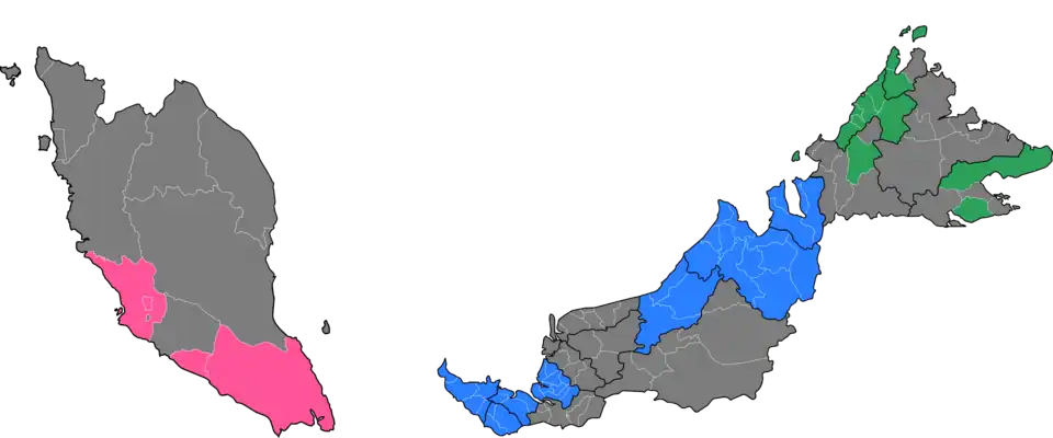 Since 2017, the organization has been franchising the state competitions to the individual organizers, who would name the state titleholders to compete in the national pageant.[3] Beginning with three state pageants in 2017 including Sabah, Sarawak, and Kuala Lumpur,[4] Melaka became the fourth member in 2018,[18] while Selangor and Johor first joined the contest in 2019 and 2020, respectively.[6] The organizer also planned to held the seventh-state pageant in Penang in 2022,[6][19] but, unfortunately, lost the franchise to HyperLive Entertainment.[5]