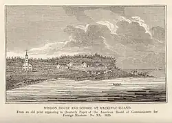 Christian missions were often the first outposts of European colonization of the North American frontier. The United Foreign Missionary Society founded a Protestant mission on Mackinac Island in 1822.[13] The objective was to train Indian youth as teachers of English, Christianity and majority American ways, and as interpreters. To support this mission, the US government transferred 12 acres at the southeast end of the island to the Society.[13] The Connecticut Missionary Society sent Rev. William Montague Ferry to the island, and he opened the school with twelve Indian children on November 3, 1823. He was assisted by his wife Amanda White Ferry and Elizabeth McFarland. The school building was framed and enclosed by workers from Detroit, using timbers obtained from a sawmill on Mill Creek (6 mi SE of current day Mackinaw City). By 1825, construction of the 2-story ‘Mission House’ was completed by Martin Heydenburk, one of the school's teachers. Because the island had no Protestant church, the east wing of Mission House was fitted with a movable partition so that on Sundays it became a chapel. Enrollment soon averaged 150 Native American pupils per year with >100 receiving free board, room, and clothing from the mission family. The southeast point of Mackinac Island became known as Mission Point.[14][1]
