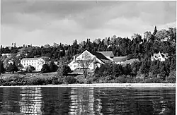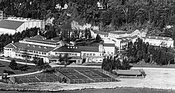 In 1957 the West Residence was built to serve international conferences. Designed by William Woollett (Los Angeles) and Rudi Barraud (Lucerne, Switzerland), it Later provided Mackinac College with administrative offices and dormitory rooms. Since then it has functioned as a hotel. In the foreground is Mission Church steeple.