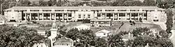 Movies that were filmed and produced in the Studio include The Crowning Experience (MRA), Decision at Midnight (1963, MRA), Voice of the Hurricane (1964, MRA), and Somewhere in Time (1980, Universal Pictures). In summer 1965 the Studio's sound stage was the site for original performances of the musical show Sing-Out ’65, when ~7,000 young people from around the world were meeting for summer MRA conferences.[40] Seating was brought in for audiences of ~1000 at the weekly Sing-Out shows. In the fall of 1965 the cast of the show began traveling throughout the US and Asia. In 1966, Sing-Out changed its name to Up With People and expanded into several international musical casts emphasizing personal change that could lead to social, economic and political change.[19][41] In late 1965 the Studio was deeded over to Mackinac College, an institution legally independent of MRA and chartered by the Michigan Board of Education.[26][42] The intent was that the many floors and rooms of the Studio would provide classroom and library space for the college. The island’s fire marshal, however, did not approve this use, so the studio served as a Fine Arts Center for the college.[43] The sound stage was then converted into a gymnasium that the College shared with Island school children for sports.