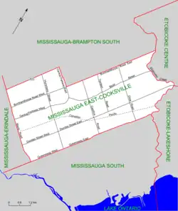 The riding was created in 2003 from parts of Mississauga Centre and Mississauga East ridings. It consists of the part of the City of Mississauga east of a line drawn from north to south along the Queensway, Mavis Road, Highway 403, Central Parkway East and Burnhamthorpe Road East.