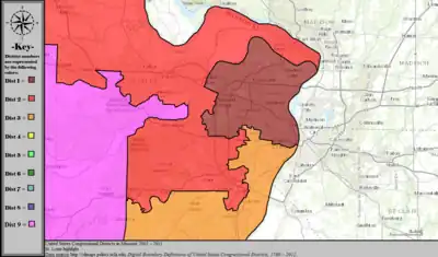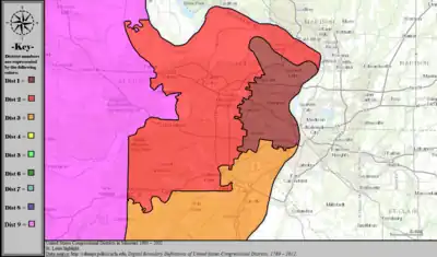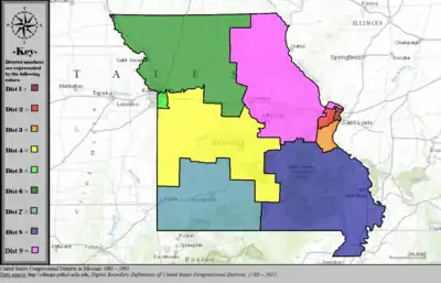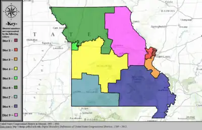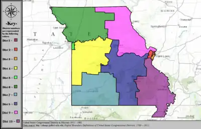 Table of United States congressional district boundary maps in the State of Missouri, presented chronologically.[4] All redistricting events that took place in Missouri between 1973 and 2013 are shown.