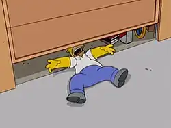 Homer getting crushed by the door of the garage while trying to clean it up. This scene was inspired by a real-life event of writer John Frink.