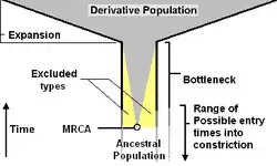 In 1979, W.M.Brown and Wilson began looking at the evolution of mitochondrial DNA in animals, and found they were evolving rapidly.[8] The technique they used was restriction fragment length polymorphism (RFLP), which was more affordable at the time compared to sequencing. In 1980, W.M. Brown, looking at the relative variation between human and other species, recognized there was a recent constriction (180,000 years ago) in the human population.[9] A year later Brown and Wilson were looking at RFLP fragments and determined the human population expanded more recently than other ape populations.[10] In 1984 the first DNA sequence from an extinct animal was done.[11] Sibley and Ahlquist apply DNA-DNA hybridization technology to anthropoid phylogeny, and see pan/human split closer than Gorilla/Pan or gorilla/human split, a highly controversial claim.[12][13] However, in 1987 they were able to support their claim.[14] In 1987, Cann, Stoneking and Wilson suggest, by RFLP analysis of human mitochondrial DNA, that humans evolved from a constrict in Africa of a single female in a small population, ~10,00 individuals, 200,000 years ago.[15]