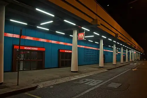Molino Dorino is a station on Line 1 of the Milan Metro in Milan, Italy. The station was opened on 28 September 1986 as a one-station extension of the line from San Leonardo. On 14 September 2005, the line was extended to Rho Fiera; Pero station was only added on 19 December 2005.[2] It is an underground station, located near the city limit. The station is located between Via Molino Dorino and Via Francesco Cilea.