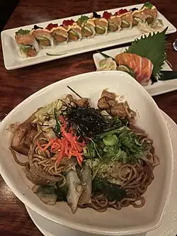 Sushi, sashimi, and yakisoba (top to bottom)