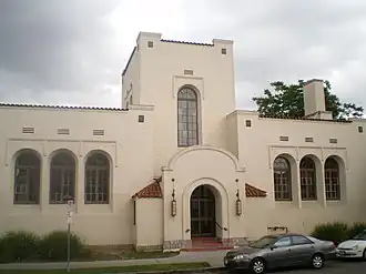 In 1987, the Moneta Branch and several other branch libraries in Los Angeles were added to the National Register of Historic Places as part of a thematic group submission.[2] The application noted that the branch libraries had been constructed in a variety of period revival styles to house the initial branch library system of the City of Los Angeles. With respect to the Moneta Branch, the application described the building as a one-story Mediterranean Revival building, constructed of brick with a stucco finish. It is designed with a symmetrical front facade, and its most visible feature is a square, central tower.[2]