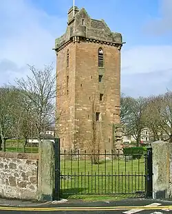 First mentioned in 1233 this was the medieval church dedicated to Saint John the Baptist, patron saint of Ayr.[20] The church was used by Cromwell's soldiers as a look-out tower as well as an armoury and chapel, the congregation had been forced out and the Auld Kirk of Ayr came to be built to house them with some financial assistance from Cromwell.[20] The 'Citadel' church was in public use again between 1687 and 1689,[16] after which it ceased to be used for worship and much of it was demolished, the tower itself only being spared as it was a valuable sea-mark for sailors and a look-out for ships.[21]