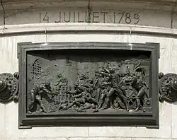 The stone pedestal is surrounded with twelve high reliefs in bronze, made by Léopold Morice.[2] Connected with rosettes and arranged at eye level, they constitute a chronology of events marking the history of the French Republic, between 1789 and 1880 :