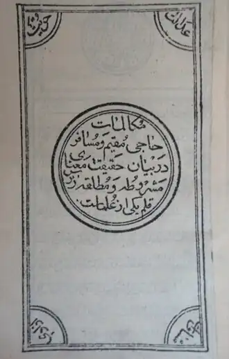 Mokalemate Moqim va Mosafer (transl. Conversation of the Resident and the Traveler, Persian: رساله مقیم و مسافر) is a political treatise by Noorollah Najafi Isfahani. The treatise was published in Isfahan in July 1909.[1][2] This treatise was written in the years between the first and the second Persian Constitutional Revolution. In this treatise, the author presents an Islamic version of the constitutional political system.[3][4] The treatise Moqim va Mosafer, which was written in constitutional history, took a prominent place in its political treatises and explored the concept of constitutional jurisprudence with the idea of a "powerful government". The treatise Moqim va Mosafer proved by the powerful principle that injustice of the constitutional state are less than monarchy and almost controllable; yet it believes that if the constitution leads to mass despotism, there will be a great deal of tyranny that cannot be easily reformed.[5]