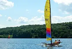 All boats up to 20 horsepower (15 kW) are permitted on Lake Arthur. All powered boats are prohibited in the Game Propagation Area. Sailing is an especially popular activity. Races and regattas are held over the course of the summers. Sailboats, rowboats, kayaks, motorboats, canoes, and pontoon boats are available to rent in the Crescent Bay Area. There are two fueling points for power boats. Tenants pay to keep boats at the park's two marinas. Davis Hollow houses both pontoons and sailboats, while Watts Bay houses sailboats and catamarans. Both marinas are on the North Shore. All boats must have a current registration from any state or a launch permit from the Pennsylvania Fish and Boat Commission. The lake is open to ice boating during the winter months. Ice boats must display a state park launch permit.[3]