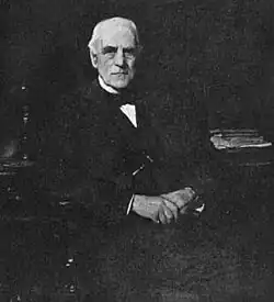 Perhaps the most prominent member of the family was J. P. Morgan (1837–1913), son of J. S. Morgan. He became exposed to his father's business deals at an early age. He worked as an accountant until eventually becoming a partner at Drexel, Morgan & Co. in 1871.[11] By 1885, he began buying out railroads and reorganizing them. Through his business strategies, the term "Morganization" was coined to describe his method of creating monopolies through buying companies, eliminating competition, and cutting costs.[12][13] By the turn of the century, he became incredibly successful in his business endeavors, controlling most of the major industries in America. During the Panic of 1907, J. Pierpont Morgan bailed out the U.S. government.