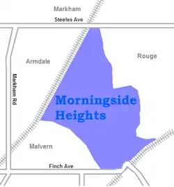 Morningside Heights is a residential neighbourhood in Toronto, Ontario, Canada. It is located in the northeast corner of the city, in the district of Scarborough, just north of the neighbourhood of Malvern and west of Rouge Park and the Rouge. The subdivision, comprising approximately 750 acres (3.0 km2), was one of the last large tracts of undeveloped land within the City of Toronto, located between Finch Avenue East and Steeles Avenue East, from Tapscott Road to the Rouge River.[1]