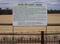 The bushranger Dan "Mad Dog" Morgan[3] roamed the area in the mid-19th century and held up the Round Hill Station property situated along the road to Culcairn. During the hold-up he fatally wounded John McLean, an employee of the station, and a grave and memorial stands at the site to commemorate the event.[4]