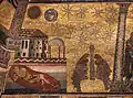 | Pharaoh's Dreams | It differs from the preceding scenes by a richer palette of colours, though this could be due to a different mosaicist, whilst its lively composition in almost pathetic tones may attribute them to the Master of the Maddalena (Pesenti, 1978–1979). The curtain over Pharaoh's bed is a late 19th-century restoration. | |