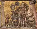 The last part of the interior to have mosaics added were the women's galleries between approximately 1300 and 1330.[1] These show angels and saints and their style agrees with Giovanni Villani's written evidence, which dates their completion to 1330 and probably dates the start of work to around 1300–1315. There are no art historical studies specifically on the mosaics of the women's galleries, though Venturi briefly notes that they were produced after 1300. The vault has a central motif of a starry sky, symbolic of the Empyrean, surrounded by angels with unclear attributes, possibly another set of angelic hierarchies.
