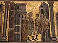 | Jacob Meets Joseph | It differs from the preceding scenes by a richer palette of colours, though this could be due to a different mosaicist, whilst its lively composition in almost pathetic tones may attribute them to the Master of the Maddalena (Pesenti, 1978–1979). |