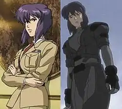 Major Motoko Kusanagi (Japanese: 草薙・素子, Hepburn: Kusanagi Motoko), or just "The Major", is the main protagonist in Masamune Shirow's Ghost in the Shell manga and anime series. She is a cybernetic human, augmented with a synthetic "full-body prosthesis". She is employed as the field commander of Public Security Section 9, a fictional anti-cybercrime law-enforcement division of the Japanese National Public Safety Commission. A strong-willed, physically powerful, and highly intelligent cyberhero, she is well known for her skills in deduction, hacking and military tactics.