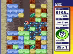 In each level, players must make it to the bottom of a well by destroying, or "drilling", colorful formations of blocks.[4] Destroying blocks results in those above it falling and connecting with similarly colored ones; should four or more matching blocks connect, they will be destroyed, which is useful for creating chain reactions.[3] Blocks will also fall if there is nothing underneath to support them, which can crush players that are underneath them. Players will need to manage their constantly-depleting oxygen, which acts as both a health bar and a timer.[5] Oxygen is replenished by collecting blue air capsules, while oxygen is lost by destroying brown X-marked blocks. If a player is next to a block with an open space above it, they can "jump" to that block.[4] There are also power-up items scattered around levels, such as those that provide a protective shield or refill the player's oxygen to 100%.[3]