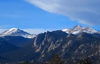 The Mummy Range (elevation approximately 13,000 ft) is a mountain range in the Rocky Mountains of northern Colorado in the United States. The range is a short subrange of the Front Range located in southwestern Larimer County northwest of the town of Estes Park. It is located largely within Rocky Mountain National Park, extending north from Trail Ridge Road approximately 15 mi (24 km). The Arapaho name is "nooku-bee3ei-no," which translates to "White Owls."[4]