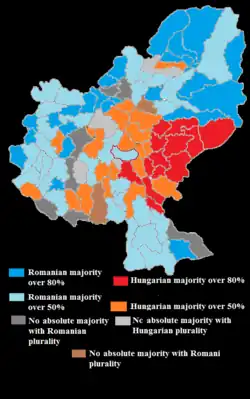 According to the census data of 1930, the county's population was 289,546, of which 45.8% were Romanians, 42.6% Hungarians, 3.9% Germans, 3.9% Romanies, 3.4% Jews, as well as other minorities. By mother tongue, the county population consisted of 45.9% Hungarian speakers, 45.5% Romanian speakers, 3.9% German speakers, 2.2% Yiddish speakers, and 2.1% Romany speakers.[5] In the religious aspect, the population consisted of 32.4% Greek Catholic, 30.3% Reformed, 14.5% Eastern Orthodox, 12.1% Roman Catholic, 3.9% Lutheran, 3.6% Jewish, 2.6% Unitarian, as well as other minorities.[6]