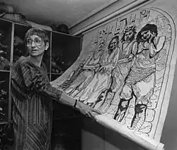 Muriel Nezhnie Helfman (February 28, 1934 – April 9, 2002), known professionally as Nezhnie, was an American artist, primarily weaving large tapestries throughout 1956–1992. She gained international attention in the late 1980s with a series of six tapestries, Images of the Holocaust, completed between 1979 and 1989. They were first exhibited as a series at the Sazama-Brauer Gallery in Chicago in 1988. Their imagery and texts are based on historical photographs of victims of Nazi persecution, such as ones by Mendel Grossman, and other materials that Nezhnie collected from the Library of Congress, National Archives, The Pentagon and the Yad Vashem Archives in Israel.