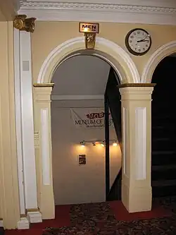 Word of the museum's collection continued to spread until, according to "Permanent Interim Acting Director" Louise Reilly Sacco, "it got completely out of hand" when a group of senior citizens on a tour bus stopped to see it.[8] In 1995, the display space was moved to the basement of the Dedham Community Theatre, a building with an aesthetic described in 2004 as "ramshackle".[13] The museum in Dedham had no fixed operating hours, instead being open while the theater upstairs was open.[14] As The Boston Globe notes, the art collection was appropriately placed "just outside the men's room",[15] where sounds and smells carry to the collection and the constant flushing of the toilet "supposedly helps maintain a uniform humidity", according to the South China Morning Post.[16]