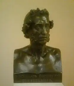 - "А. S. Pushkin and Orenburg". The exposition is about Alexander Pushkin's visit to Orenburg from 18 to 20 September 1833. He was accompanied by Vladimir Dal on a journey through the Orenburg province to collect information about the Pugachev rebellion, including eyewitness accounts for the A History of Pugachev and for later written Captain's Daughter. The hall features canvases by Orenburg artist Nikolay Eryshev, including A.S. Pushkin and V.I. Dal on the Bank of Ural and Pushkin's Conversation with the Cossack Buntova in the Berdskaya Sloboda. The interior of the noble drawing room is from the first half of the 19th century. It also contains a bust of Pushkin made of Kasli cast iron in 1899.[8] This sculpture was produced at the Kaslinsky foundry based on a marble bust by Ivan Vitali. The bust was created with the participation of Pavel Nashchokin after Alexander Pushkin's death.[18]