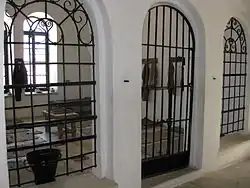 In the cells the prisoners' brown garb, the "burshes" (mats) upon which the prisoners slept, and the "kardal", the bucket that was used as a toilet can be seen. The bed in the corner near the window was for the "mukhtar", the prisoner that the British made responsible for the conduct of the prisoners in the cell.