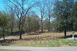 This section contains over 377 Confederate and Union soldiers including 85 Unknown Union and/or Confederate Soldiers [Ref: A History of Rome and Floyd County, Battey, pp. 622 and see also Rome and Floyd County: An Illustrated History, Sesquicentennial Edition, 1985, pp 39. The first reference states that the Unknown graves are Confederate, while the second source states that the unknown graves are Union. More definitive information is needed for clarification]. They lost their lives in the battles of the American Civil War from Rome and other places. Dr. Samuel H. Stout, the physician in charge of all the hospitals that served the Army of Tennessee, ordered that all permanently disabled patients be sent to Rome. Many are buried in this section. The buildings and churches that were used as hospitals for the fallen soldiers were spared from General William Sherman's November 1864 order of burning buildings on Broad Street. Most are still standing and are on the National Register of Historic Places. The section's graves were marked with painted wooden markers between 1863 and 1900. Sometime after 1900, their wooden markers were replaced with the present stone markers that still exist. The section is called the Confederate Section of the Cemetery, but is not limited to just soldiers from the Civil War. A few graves are those of soldiers from subsequent wars; and one woman, buried at the feet of her husband.[9]