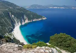 Myrtos has been described as "one of the most dramatic beaches in Greece", with its "mile-and-a-half long arc of dazzling white pebbles."[4]