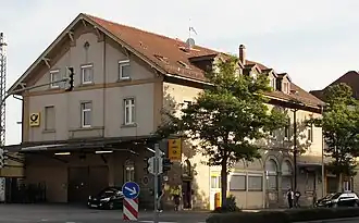 The station building from 1859 is a two-storey building with a gabled roof. Windows and doors on the ground floor were built with Rundbogenstil (Romanesque Revival) arches, which are still visible. It originally had a length of 25.78 metres and a width of 14.32 metres. From the street side passengers reached the platform through a narrow main hall. The building accommodated a waiting room and service rooms for the railway employees, as well as the post office. The building was later given a southward extension. Upstairs apartments were provided for railway staff. In 1893, the post office moved into its own building south of the station building. In 1934, the post office took over the old entrance building from the railways.