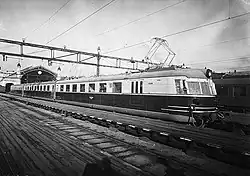 On 9 June 1947, the class was also taken into use from Oslo West Station (Oslo V) on the Vestfold Line, and along the Sørlandet Line to Kongsberg. From the 1 June 1949, after the Sørlandet Line was electrified to Kristiansand, these services were shifted to the Sørlandet Express.[1] On 15 November 1950, one unit was involved in the Hjuksebø train disaster, and the end car needed to be fully rebuilt.[2] From 1 December 1956, when the whole Sørlandet Line to Stavanger was electrified, the service was extended and rebranded the Stavanger Express. To free up sufficient stock, the Østfold Express was discontinued on 14 November 1956. The Sørlandet Express operated each day, while the Stavanger Express only operated three times a week. However, the Stavanger Express did not prove a success, featuring low passenger numbers, and the last train ran on 24 August 1958. The trains remained in service on the Sørlandet Express until 27 May 1967.[1]