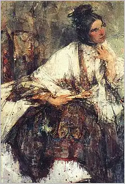 Nadezhda Mikhailovna Sapozhnikova was born in Kazan on 26 March 1877, the seventh child in the merchant family of Mikhail and Serafima Sapozhnikova. Her father owned a manufactory shop. Despite having 11 children, Serafima Sapozhnikova educated them by herself without hiring a governess. In 1888, Nadezhda was enrolled to the Marrinski Women’s Gymnasium where she showed drawing abilities. After graduating in 1895, Nadezhda Sapozhnikova received a home teacher degree, and taught in the local sunday school.[1] Besides, she also graduated from the music school of Rudolf Gummert.[2] At that time, Sapozhnikova expressed her aesthetic aspirations through wood-crafting and porcelain painting; her teacher advised Nadezhda to do art professionally. Before that, Sapozhnikova received medical education and became a Sister of Mercy, but was too sensitive to work in a hospital. In 1904, at the age of 27, Nadezhda Sapozhnikova got enrolled in the Kazan Art School. She demonstrated notable success, but her talents were fully realized only when in 1908 painter Nicolai Fechin moved to Kazan.[1] Fechin was Sapozhnikova's professor, but because she was older than him for four years and had a higher level of cultural and common education than other students, they soon started to communicate on equal terms.[3] For many years of friendship with Nadezhda, Fechin painted five portraits of hers, the first of which appeared in 1908. This work was famous under different names: "Portrait of N. M. S. in shawls" (Russian: Портрет Н. М. С. в шали) and "Portrait of M-lle Sapozhnikova" (Russian: Портрет М-lle Сапожниковой). The second name was mainly used in international exhibitions. Fechin debuted with this portrait at the international exhibition «Carnegie Institute» in Pittsburgh.[1]