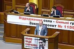 In late November 2014, Savchenko signed her parliamentary oath and passed it to Ukraine through her lawyer and was thus sworn in as People's Deputy of Ukraine (MP) on 27 November 2014.[18][81]