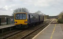 The station has two platforms, separated by two running lines. The line runs on a slight curve through the station, at an angle of roughly 067 degrees,[5] and has a linespeed of 100 miles per hour (160 km/h). The northern platform, platform 2, is 121 metres (132 yd) long and serves eastbound trains; the southern platform, platform 1, is 122 metres (133 yd) and serves westbound trains.[6] Access to the two platforms is by steps from the road on either side. There is a ramp to the eastbound platform, but it has a gradient greater than 1 in 12, and there is no ramp access to trains. There is no ramp access to the westbound platform. Access between the platforms is either by a footbridge, or by walking along the main road under the line.[7] There are metal and glass waiting shelters on both platforms – three on the eastbound platform, one on the westbound.[1] Two ticket machines are situated on the north side of the station, which can also be used to collect pre-bought tickets. These machines are supplemented by a small ticket kiosk on the eastbound platform which is open during the morning peak.[7] "Next train" dot-matrix displays and an automated public-address system announce approaching services.
