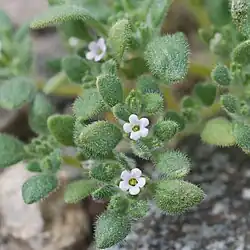 Nama pusillum is a hairy annual plant forming a small patch of prostrate stems no more than about 6 centimeters long. The fuzzy reddish or green leaves are up to a centimeter long and oval or lance-shaped, with winged petioles. The tiny funnel-shaped flowers are white to pale pink in color and have five-lobed faces just 1 or 2 millimeters wide.