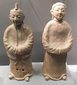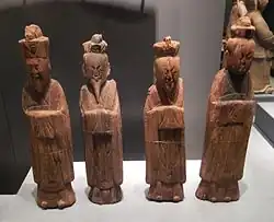 Left: Pottery funerary figurines of two Khitan male servants, unearthed in Chenzhuang, Changping District. Right: Liao-era wooden funerary figurines representing four of the twelve zodiac animals, unearthed in 1979 from the tomb of Ma Zhiwen in Daxing District.