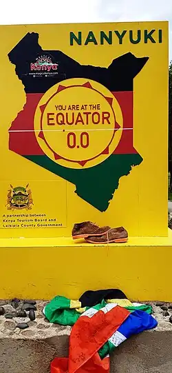 Maasai herders found red ochre in Nanyuki, the ground resembled roan coated cattle. The town saw British immigrants settle there during the early days of colonial Kenya in 1907. Some of their descendants still live in or around the town. Major Digby Tatham-Warter, a British Army officer famed for carrying an umbrella into battle, moved to Nanyuki after World War II and lived on his farm until his death in 1993. During the Mau Mau Uprising, Digby raised a volunteer mounted police force at his own expense and led them against the Mau Mau.[1] [2] The town is noted for small- and large-scale farms, ranches and pastoral lands, and wildlife conservancies. Nanyuki is also the base for people seeking to climb Mount Kenya. The town sits almost on the Equator, an Equator sign was erected by the government of Kenya beside the A2 road.