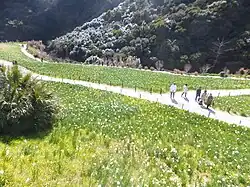 Narcissi have been used decoratively for a long time, a wreath of white-flowered N. tazetta having been found in an ancient Egyptian grave, and in frescoes on the excavated walls of Pompeii.[16] It is thought to have been mentioned in the Bible, for instance in the Book of Isaiah.[17] The rose mentioned here being the original translation into English from the Biblical Hebrew word chabatstsileth (Hebrew: חבצלת). This so-called "Rose of Sharon" being actually a bulbous plant, probably N. tazetta[18] which grows in Israel on the Plain of Sharon,[19] where it is a protected plant.[20][21] They make a frequent appearance in classical literature.[22]